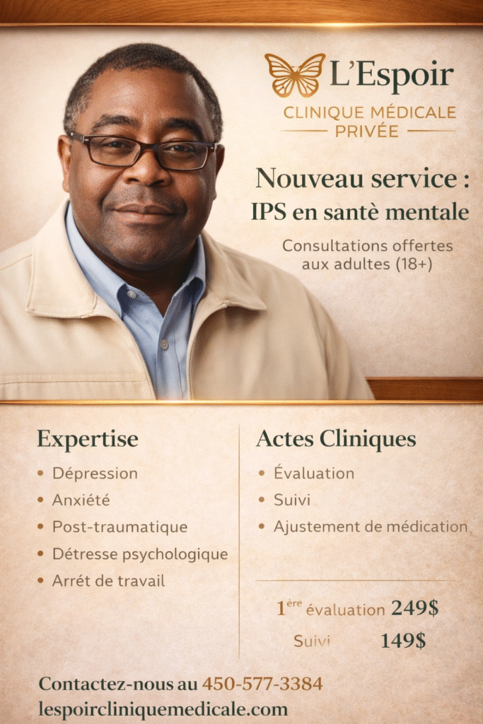 Notre équipe de professionnels de la santé hautement qualifiés est dévouée à fournir des soins attentionnés et complets à chaque patient. Que vous ayez besoin d’une consultation médicale générale, de soins spécialisés ou de services de suivi régulier, nous sommes là pour vous accompagner à chaque étape de votre parcours vers une meilleure santé.